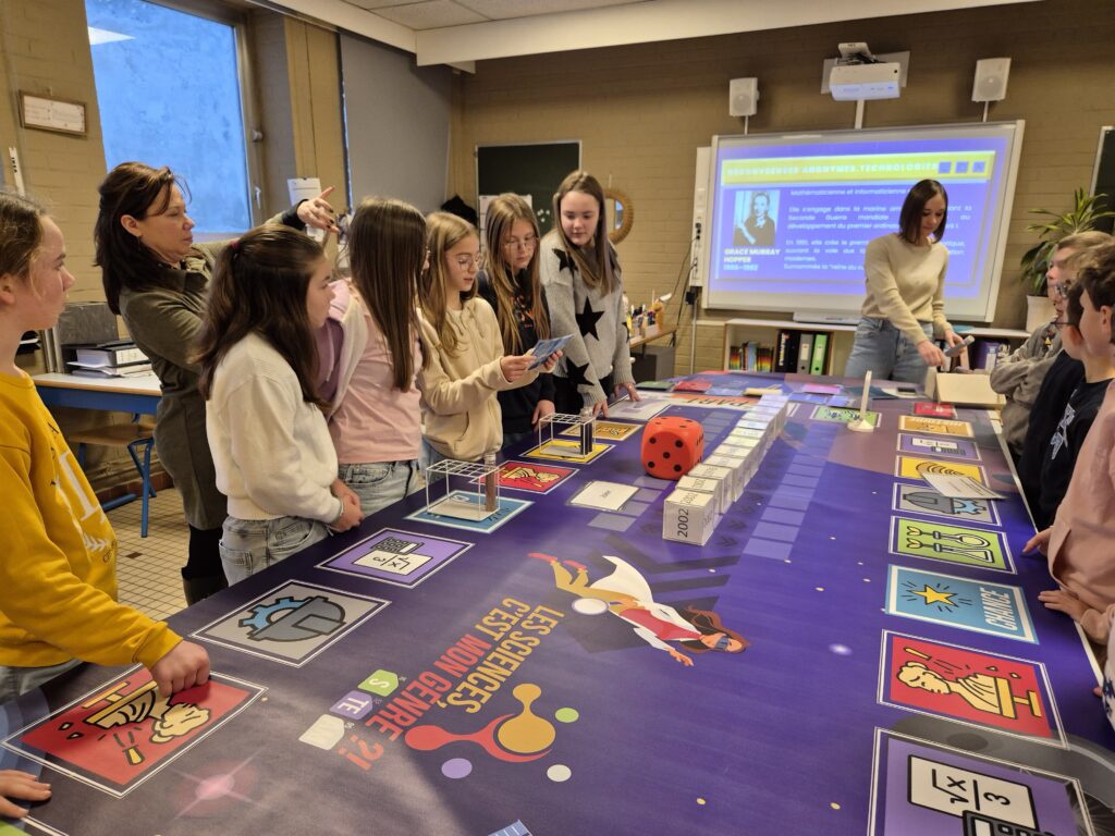 La deuxième partie s’articule autour d’un jeu de plateau géant. En équipes, les participant·e·s incarnent des chercheur·e·s et progressent case après case en répondant à des questions, en relevant des défis et en collectant des éprouvettes. Ce parcours met en lumière des femmes qui ont marqué les sciences, explore les domaines et métiers STEAM et replace des dates clés et des statistiques interpellantes.